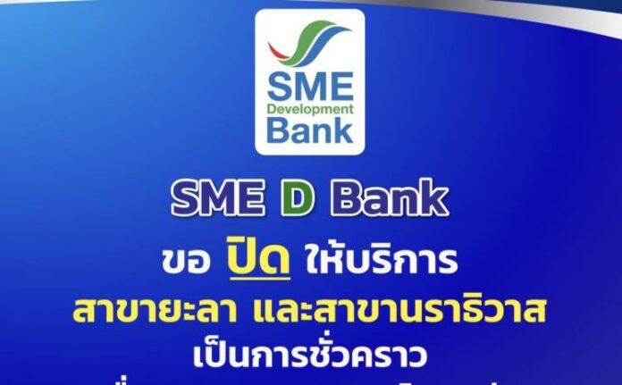 SME D Bank ขอแจ้งปิดให้บริการสาขายะลา และสาขานราธิวาส เป็นการชั่วคราวในวันที่ 28-29 พฤศจิกายน 2567 เนื่องจากสถานการณ์อุทกภัยในพื้นที่