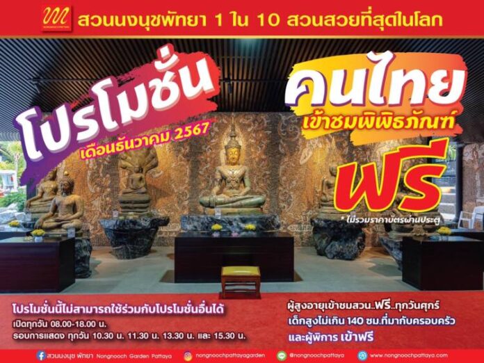 สวนนงนุชพัทยาโดย นายกัมพล ตันสัจจา ประธานสวนนงนุชพัทยา จัดโปรโมชั่นส่งท้ายปีเข้าชมพิพิธภัณฑ์พระพุทธคุณฟรีอย่างต่อเนื่องเป็นเดือนที่สามติดต่อกัน เนื่องจากที่ผ่านมามีผู้สนใจเข้าชมเกือบ 3 หมื่นคน โดยเริ่มตั้งแต่วันที่ 1 ถึง 31 ธันวาคม 2567 (เฉพาะนักนักท่องเที่ยวชาวไทย)