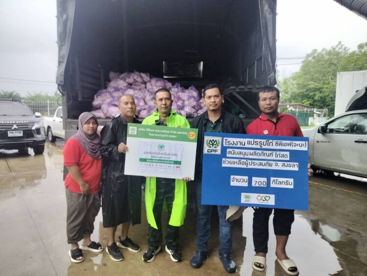 ที่ผ่านมา ได้สนับสนุนวัตถุดิบแก่โรงครัวต่าง ๆ กระจายในหลายพื้นที่ โดยมีเป้าหมายจำนวน 100 โรงครัว ผ่านโครงการ “CP-CPF ส่งอาหารจากใจ สู้ภัยน้ำท่วม” มอบไข่ไก่สด เนื้อไก่ น้ำมันพืช น้ำดื่ม และข้าวตราฉัตร ให้กับมณฑลทหารบกที่ 42 และค่ายเสนาณรงค์ เพื่อนำไปปรุงอาหารแจกจ่ายผู้ประสบภัย นอกจากนี้ยังมีการบูรณาการพนักงานจิตอาสา โดยซีพี แอ็กซ์ตร้า นำพนักงานจากแม็คโครและโลตัสลงพื้นที่ เช่น อำเภอเมืองและอำเภอจะนะ พร้อมมอบน้ำดื่มและถุงยังชีพแก่ผู้ประสบภัย ใน จ.สงขลา รวมถึงการสนับสนุนด้านเทคโนโลยีและการสื่อสาร โดยทรู คอร์ปอเรชั่น ส่งรถโมบายล์ชุมสายเคลื่อนที่เร็ว พร้อม Free WiFi และจุดชาร์จแบตเตอรี่ในพื้นที่ 10 โรงครัว นอกจากนี้ ยังมอบซิมอินเทอร์เน็ต 10 GB พร้อมค่าโทรฟรี 100 นาที ให้ผู้ประสบภัยครอบคลุมทั้ง 5 จังหวัด