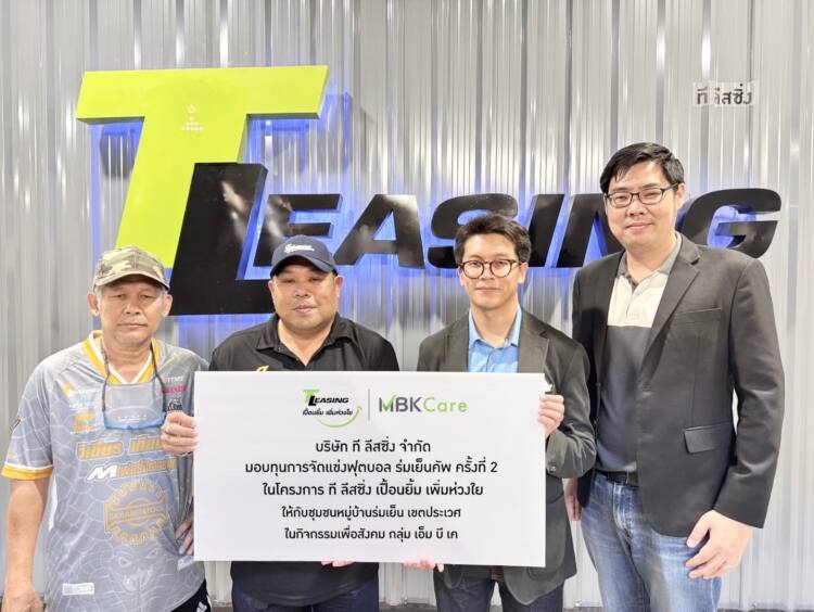 นายปรัชญา ติงสะ รองกรรมการผู้จัดการกลุ่มงานบริ หารงานขายและบริหารหนี้ (ที่ 3 จากซ้าย) และ นายพีรพงศ์ วิบูลธำรงวสุ รองกรรมการผู้จัดการสายกลยุทธ์ และพัฒนาผลิตภัณฑ์ บริษัท ที ลีสซิ่ง จำกัด (ที่ 4 จากซ้าย) มอบทุนสนับสนุนการจัดการแข่งขั นกีฬาฟุตบอล ร่มเย็นคัพ ครั้งที่ 2 กลุ่มเยาวชนอายุไม่เกิน 12 ปี ใน โครงการ ที ลีสซิ่ง เปื้อนยิ้ม เพิ่มห่วงใย เพื่อส่งเสริมให้เยาวชนใช้ เวลาว่างให้เกิดประโยชน์ พัฒนาทักษะการเข้าสังคม เสริมสร้างความมั่นใจ สร้างวินัย ความทุ่มเทและความอดทน ซึ่งจะจัดขึ้นที่สนามฟุตบอล MD4 ARENA เลียบวงแหวนด่านทับช้าง โดยรายได้ทั้งหมดของการแข่งขั นมอบให้เป็นสาธารณประโยชน์แก่ กลุ่มคนพิการ และกลุ่มผู้สูงอายุ ในชุมชน โดยมี นายทรงยศ อัมพุมน ประธานชุมชนหมู่บ้านร่มเย็น (ที่ 2 จากซ้าย) เป็นผู้รับมอบ ณ สำนักงานใหญ่ ชั้น 3 ศูนย์การค้าพาราไดซ์ เพลส เมื่อเร็ว ๆ นี้