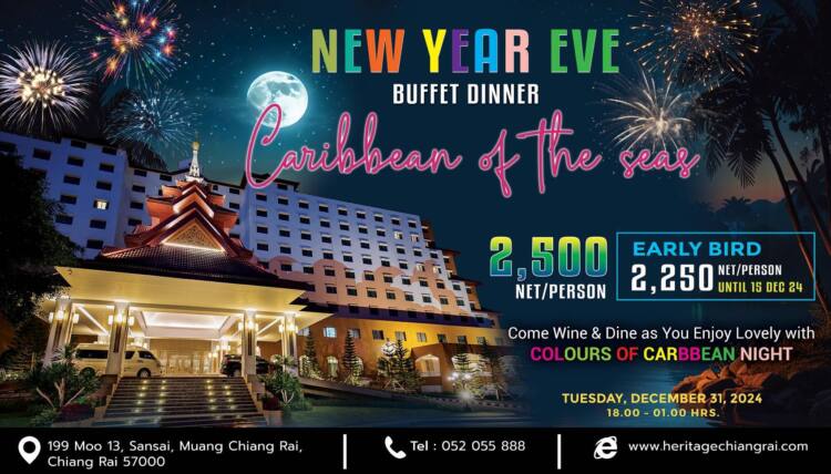 เริ่มต้นที่ ,.- ห้องดีลักซ์ไม่รวมอาหารเช้า และ New Year Eve Buffet Dinner ในบรรยากาศ ” Caribbian of the Seas” ในราคาท่านละ2,500 จองก่อนภายในวันที่ 15 ธันวาคม 2567 จ่ายเพียง 2,250 บาท