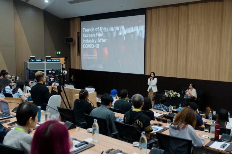 คุณคิมฮโยมิน (Kim Hyomin) กล่าวถึงความรู้สึกของการได้เป็นหนึ่งในวิทยากรของโครงการนี้ว่า “รู้สึกเป็นเกียรติอย่างยิ่งที่ได้มีโอกาสมาร่วมงานและพบปะกับบุคลากรในวงการอุตสาหกรรมคอนเทนต์ไทย เพราะในช่วงไม่นานมานี้ได้มีโอกาสรับชมผลงานจากประเทศไทยบนแพลตฟอร์มออนไลน์ต่าง ๆ และรู้สึกว่าวงการภายนตร์และซีรีส์ไทยมีความน่าสนใจและมีศักยภาพที่จะสามารถเติบโตได้อย่างสดใส โดยตลอดการอบรมกว่า 1 สัปดาห์ ได้มีโอกาสนำประสบการณ์กว่า 20 ปีมาถ่ายทอดให้กับนักเขียนบทชาวไทยที่เข้าร่วมโครงการ ได้แลกเปลี่ยนความรู้และเคล็ดลับที่ช่วยให้การเขียนบทน่าสนใจและน่าติดตามมากขึ้น ผู้เข้าร่วมโครงการทุกท่านมีความสนใจและใส่ใจในการเรียนและการพัฒนาผลงานของตนเอง หวังว่าการอบรมในครั้งนี้ผู้เรียนจะนำความรู้และประสบการณ์ไปปรับใช้กับผลงานของตัวเองได้ รวมถึงเป็นหนึ่งในแรงบันดาลใจและแรงผลักดันให้กับนักเขียนชาวไทยทุกท่านในการพัฒนาอาชีพของตนเองและอุตสาหกรรมคอนเทนต์ไทยให้เติบโตมากยิ่งขึ้น”