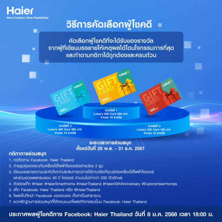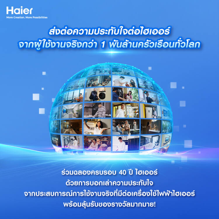 กรุงเทพฯ 12 ธันวาคม 2567 – ไฮเออร์ (ประเทศไทย) ผู้นำด้านผลิตภัณฑ์และนวัตกรรมเครื่องใช้ไฟฟ้าระดับโลกและแบรนด์เครื่องใช้ไฟฟ้าอันดับ 1 ของโลกติดต่อกัน 15 ปีซ้อน จัดกิจกรรมสุดยิ่งใหญ่เนื่องในโอกาสครบรอบ 40 ปี ไฮเออร์ทั่วโลก เชิญชวนลูกค้าเครื่องใช้ไฟฟ้าไฮเออร์ทุกท่าน มาแชร์ความสุขและร่วมบอกเล่าความประทับใจที่ได้รับจากประสบการณ์การใช้งานจริงที่มีต่อเครื่องใช้ไฟฟ้าไฮเออร์ผ่านทางแอปพลิเคชัน Facebook ได้ง่าย ๆ เพียงกดติดตาม Facebook: Haier Thailand และถ่ายรูปคู่ของคุณกับเครื่องใช้ไฟฟ้าไฮเออร์อย่างน้อย 2 รูป พร้อมเขียนบรรยายความประทับใจจากประสบการณ์การใช้งานจริงที่คุณมีต่อเครื่องใช้ไฟฟ้าไฮเออร์ และร่วมอวยพรครบรอบ 40 ปี ไฮเออร์ เพียงเท่านี้ก็สามารถลุ้นรับบัตรกำนัล Lotus’s Gift Card สุดพิเศษกว่า 30 รางวัล เอาใจสายช้อปอย่างจุใจ โดยสามารถร่วมสนุกได้ตั้งแต่วันนี้ – 31 ธ.ค. 2567 และสามารถดูเงื่อนไขการร่วมสนุกเพิ่มเติม พร้อมประกาศผลผู้โชคดีทาง Facebook: Haier Thailand