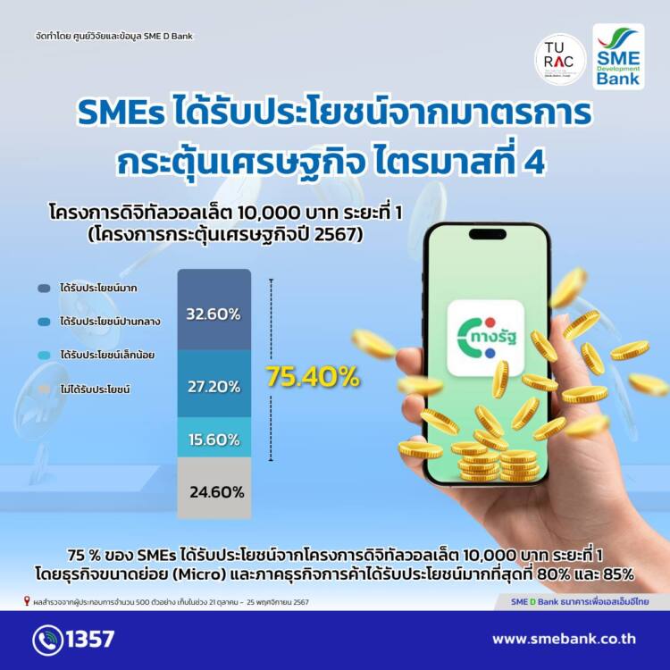 ส่วนความคิดเห็นต่อมาตรการกระตุ้นเศรษฐกิจโครงการดิจิทัลวอลเล็ต 10,000 บาท (ระยะที่ 1) ผู้ประกอบการเอสเอ็มอีกว่า 75% ระบุว่าได้รับประโยชน์ โดยธุรกิจขนาดย่อย และภาคธุรกิจการค้าเป็นกลุ่มที่ได้รับประโยชน์มากสุด อยู่ที่ระดับ 80% และ 85% ตามลำดับ