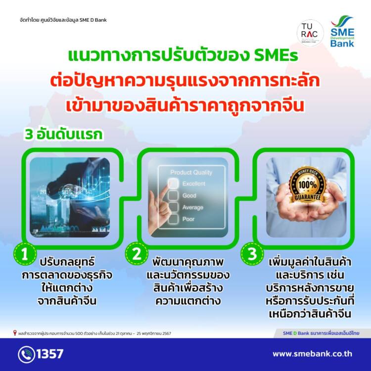 ขณะที่ ผู้ประกอบการเอสเอ็มอีกว่า 56% ระบุว่า ได้รับผลกระทบจากการทะลักเข้ามาของสินค้าจีนราคาถูก โดยธุรกิจขนาดย่อย และภาคธุรกิจการค้า ได้รับผลกระทบมากที่สุด พร้อมระบุว่า หากในอนาคตยังมีสินค้าจีนราคาถูกทะลักเข้ามาอย่างต่อเนื่อง ผู้ประกอบการเอสเอ็มอีจะได้รับผลกระทบเพิ่มขึ้นเป็น 58% ในทุกขนาดธุรกิจและทุกประเภทธุรกิจ ซึ่งแนวทางปรับตัวของผู้ประกอบการเอสเอ็มอีต่อประเด็นดังกล่าว 3 อันดับแรก ได้แก่ 1.ปรับกลยุทธ์การตลาดของธุรกิจให้แตกต่างจากสินค้าจีน 2.พัฒนาคุณภาพและนวัตกรรมของสินค้าเพื่อสร้างความแตกต่าง และ 3.เพิ่มมูลค่าในสินค้าและบริการ