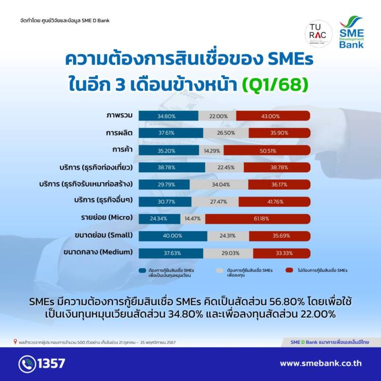 ขณะเดียวกันยังรวมถึง ผู้ประกอบการเอสเอ็มอี เชื่อมั่นผลประกอบการและสภาพคล่องปรับเพิ่มขึ้น จะลงทุนและจ้างงานเพิ่มขึ้นจากไตรมาสก่อน ความต้องการกู้ยืมสินเชื่อ ในไตรมาส 1/2568 ผู้ประกอบการเอสเอ็มอี มีความต้องการ คิดเป็นสัดส่วน 56.80% ในการใช้เป็นเงินทุนหมุนเวียน สัดส่วน 34.80% และเพื่อลงทุน สัดส่วน 22.00%