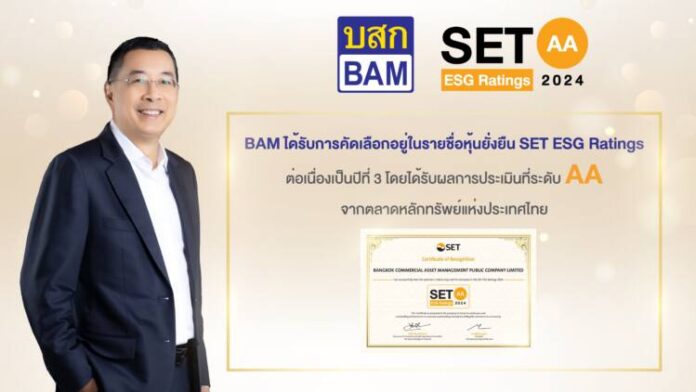 บริษัทบริหารสินทรัพย์ กรุงเทพพาณิชย์ จำกัด (มหาชน) หรือ BAM ได้รับการประเมินหุ้นยั่งยืน SET ESG Rating ประจำปี 2567 ในกลุ่มธุรกิจการเงิน ระดับ AA ของตลาดหลักทรัพย์แห่งประเทศไทย ต่อเนื่องเป็นปีที่ 3 จากบริษัทจดทะเบียนที่เข้าร่วมการประเมินทั้งสิ้น 228 บริษัท ซึ่งในปีนี้ BAM มีผลคะแนนที่สูงขึ้นกว่าปีที่ผ่านมาในทุกมิติ สะท้อนให้เห็นว่า BAM ให้ความสำคัญต่อการดำเนินธุรกิจอย่างยั่งยืน โดยยกระดับการดำเนินงานและการจัดทำรายงานความยั่งยืนภายใต้กรอบ ESG (Environmental, Social and Governance) ทั้งในมิติเศรษฐกิจ ธรรมาภิบาล สิ่งแวดล้อม ผู้คนและสิทธิมนุษยชน ซึ่งมีการนำแนวคิดด้านความยั่งยืนเข้าเป็นส่วนหนึ่งในกระบวนการดำเนินธุรกิจ พร้อมรับมือกับปัจจัยการเปลี่ยนแปลงด้านสังคมและสิ่งแวดล้อม ตลอดจนให้ความสำคัญกับผู้มีส่วนได้เสียทุกภาคส่วนได้อย่างสมดุล