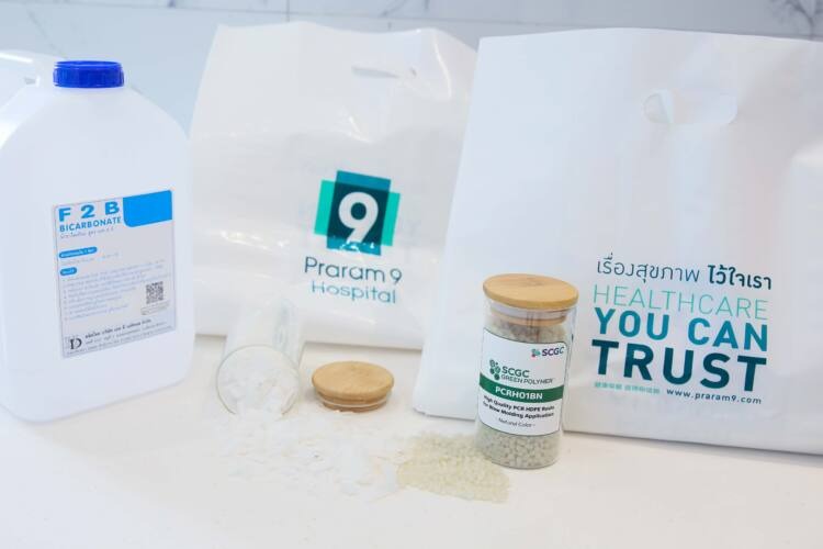 นายชาตรี เอี่ยมโสภณา ประธานเจ้าหน้าที่สายงานพาณิชย์ SCGC เผยว่า “SCGC ได้นำแนวทาง ESG มาใช้ในการดำเนินธุรกิจอย่างต่อเนื่อง โดยมีเป้าหมายหลัก คือ การใช้ทรัพยากรให้เกิดประโยชน์สูงสุดตามหลักเศรษฐกิจหมุนเวียนมุ่งสู่ Low Waste, Low Carbon เพื่อตอบโจทย์ความยั่งยืน พร้อมสร้างวิถีใหม่สู่สังคมคาร์บอนต่ำ หัวใจสำคัญของหลักเศรษฐกิจหมุนเวียน คือ การบริหารจัดการให้พลาสติกใช้แล้วหมุนเวียนกลับเข้าสู่กระบวนการรีไซเคิลอย่างครบวงจร ซึ่ง SCGC มีความเชี่ยวชาญและได้คิดค้นพัฒนานวัตกรรมรีไซเคิลขั้นสูงมาอย่างต่อเนื่องจนเป็นที่ยอมรับจากแบรนด์ต่าง ๆ สามารถผลิตเม็ดพลาสติกรีไซเคิลคุณภาพสูง ภายใต้แบรนด์ SCGC Green PolymerTM เพื่อป้อนตลาดรักษ์โลก เช่น บรรจุภัณฑ์สำหรับผลิตภัณฑ์ดูแลเส้นผมและบำรุงผิว แกลลอนน้ำยาล้างจาน ขวดน้ำมันหล่อลื่น และถังสีทาอาคาร เป็นต้น สำหรับความร่วมมือกับโรงพยาบาลพระรามเก้าในครั้งนี้ เป็นการนำแกลลอนน้ำยาล้างไตใช้แล้วกลับเข้าสู่กระบวนการรีไซเคิลระบบปิดอย่างครบวงจร เปลี่ยนเป็นเม็ดพลาสติกรีไซเคิลคุณภาพสูงพอลิเอทิลีนความหนาแน่นสูง (High Quality PCR HDPE Resin) เพื่อนำไปผลิตเป็นถุงพลาสติกรีไซเคิลกลับมาใช้ภายในโรงพยาบาล โดยถุงพลาสติกรีไซเคิลนี้มีส่วนผสมของเม็ดพลาสติกรีไซเคิลคุณภาพสูงพอลิเอทิลีนความหนาแน่นสูงถึง 30%”