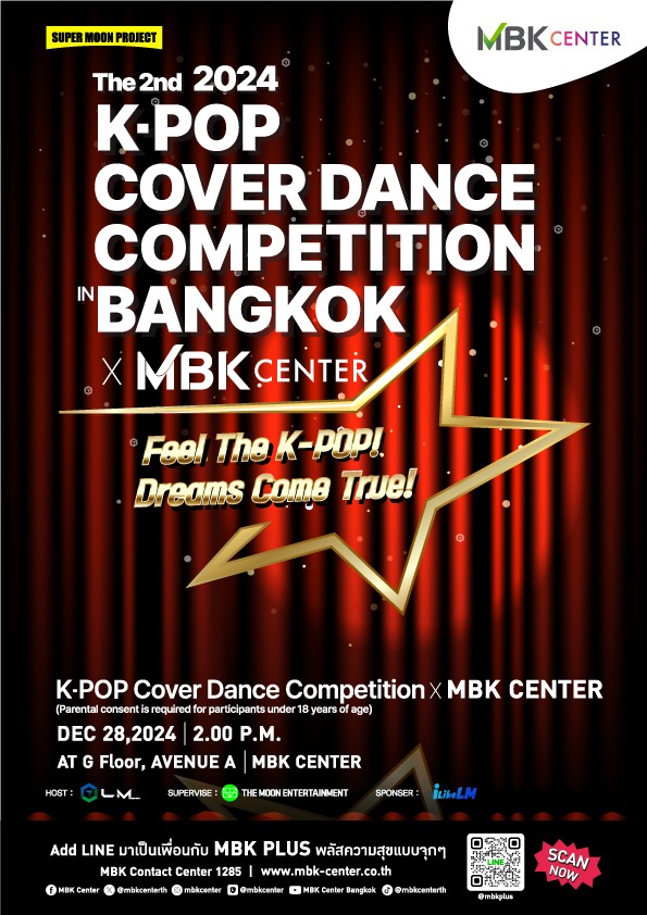 ศูนย์การค้าเอ็ม บี เค เซ็นเตอร์ ชวนชมการแข่งขันโคฟเวอร์แดนซ์ SUPER MOON PROJECT The 2nd 2024 – K-POP COVER DANCE COMPETITION IN BANGKOK X MBK Center ซึ่งจะเปิดฉากประชันสเต็ปการแข่ งขันคัดเลือกรอบแรก ในวันเสาร์ที่ 28 ธันวาคม 2567 เวลา 14.00 น.เป็นต้นไป บริเวณชั้น G ลานกิจกรรมเอ็ม บี เค อเวนิว โซน A