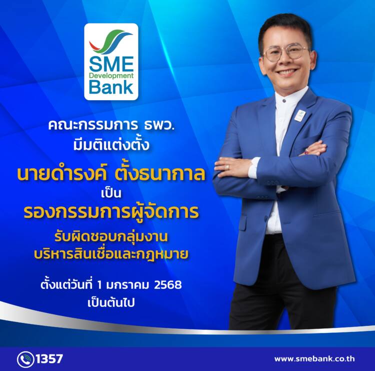 คณะกรรมการ ธนาคารพัฒนาวิสาหกิจขนาดกลางและขนาดย่อมแห่งประเทศไทย (ธพว.) มีมติเห็นชอบแต่งตั้ง “นายดำรงค์ ตั้งธนากาล” ดำรงตำแหน่ง “รองกรรมการผู้จัดการ” ผู้รับผิดชอบกลุ่มงานบริหารสินเชื่อและกฎหมาย ธนาคารพัฒนาวิสาหกิจขนาดกลางและขนาดย่อมแห่งประเทศไทย มีผลตั้งแต่วันที่ 1 มกราคม 2568 เป็นต้นไป