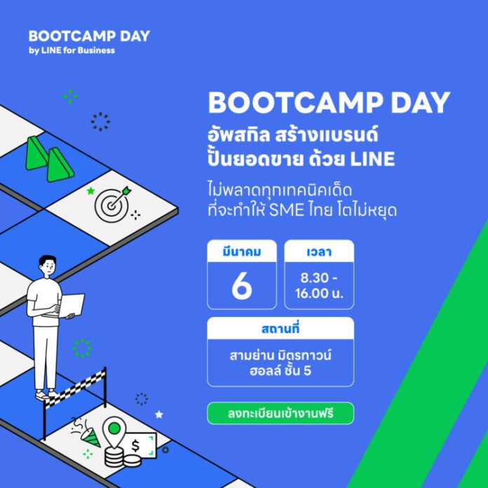 เตรียมพบกับ BOOTCAMP DAY 2025 การกลับมาของอีเวนท์ใหญ่แห่งปีจาก LINE for Business ที่ ผู้ประกอบการ SME ไทยไม่ควรพลาด! ภายใต้แนวคิด “อัพสกิล สร้างแบรนด์ ปั้นยอดขายด้วย LINE” รวมพลังกูรูด้านการตลาดและผู้เชี่ยวชาญด้านการสร้างแบรนด์ระดับแถวหน้าของเมืองไทย ร่วมถ่ายทอดประสบการณ์ เคล็ดลับความสำเร็จมากมาย รวมทุกกลยุทธ์ เทคนิคการสร้างแบรนด์ให้ปัง เพื่อสร้างยอดขาย นำไปสู่การเติบโตได้อย่างยั่งยืน พบกันวันพฤหัสบดีที่ 6 มีนาคมนี้ ณ สามย่านมิตรทาวน์ ฮอลล์ ชั้น 5 ศูนย์การค้าสามย่านมิตรทาวน์ เปิดให้ SME ที่สนใจ ลงทะเบียนเข้าร่วมงานฟรี! ได้แล้ววันนี้