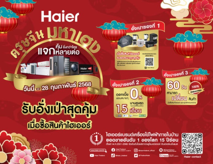 23 มกราคม 2568 – ไฮเออร์ (ประเทศไทย) ผู้นำด้านผลิตภัณฑ์และนวัตกรรมเครื่องใช้ไฟฟ้าระดับโลกและแบรนด์เครื่องใช้ไฟฟ้าอันดับ 1 ของโลกติดต่อกัน 16 ปีซ้อน เปิดศักราชต้อนรับปีมะเส็งในเทศกาลตรุษจีนสุดยิ่งใหญ่ พร้อมขานรับมาตรการกระตุ้นเศรษฐกิจไทย Easy E-Receipt 2.0 ปี 2568 จัดกิจกรรม “ตรุษจีนมหาเฮง แจกหลายต่อ คุ้มยิ่งกว่าใคร” เมื่อซื้อสินค้าไฮเออร์ที่ร่วมรายการ รับเลยอั่งเป่าสุดคุ้มถึง 3 ซอง! ง่าย ๆ ดังนี้