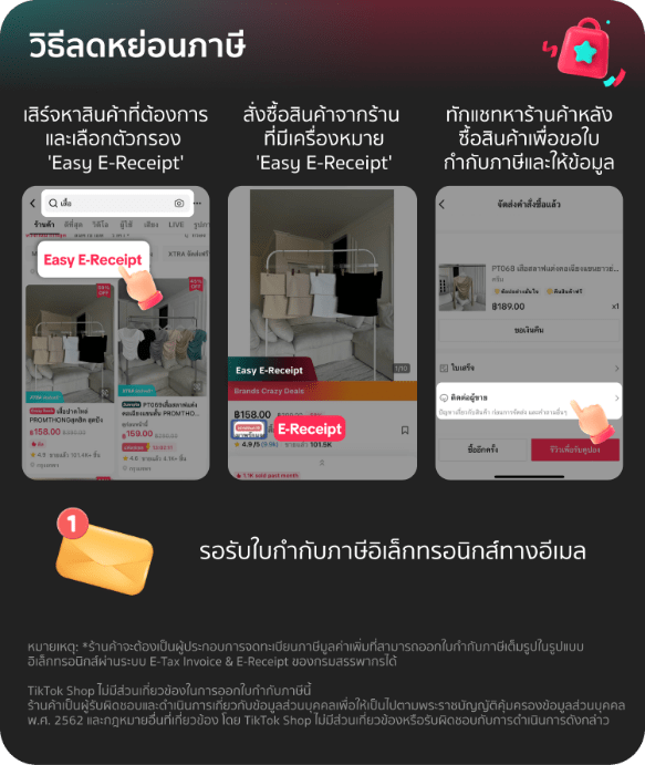 ร้านค้าและผู้บริโภคสามารถคลิกอ่านข้อมูลเพิ่มเติมเกี่ยวกับโครงการ Easy E-Receipt 2.0 บน TikTok Shop ได้ที่ TikTok Shop Academy.
