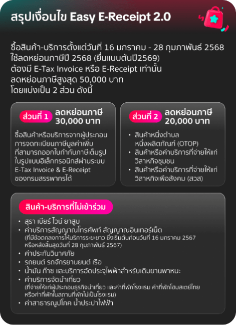 ** ทั้งนี้สำหรับปี 2568 ปรับเปลี่ยนหลักเกณฑ์ โดยแบ่งเป็นส่วนแรก 30,000 บาท เป็นใช้จ่ายในร้านค้าทั่วไป ส่วนที่สอง 20,000 บาท ใช้กับวิสาหกิจชุมชน ร้านโอทอป วิสาหกิจเพื่อสังคม *ทั้งนี้ค่าซื้อสินค้าหรือค่าบริการตามข้อ (1) รวมถึงค่าซื้อสินค้าหรือค่าบริการตามข้อ (2) ด้วย เช่น ซื้อสินค้า OTOP 50,000 บาท สามารถหักลดหย่อนได้ 50,000 บาท