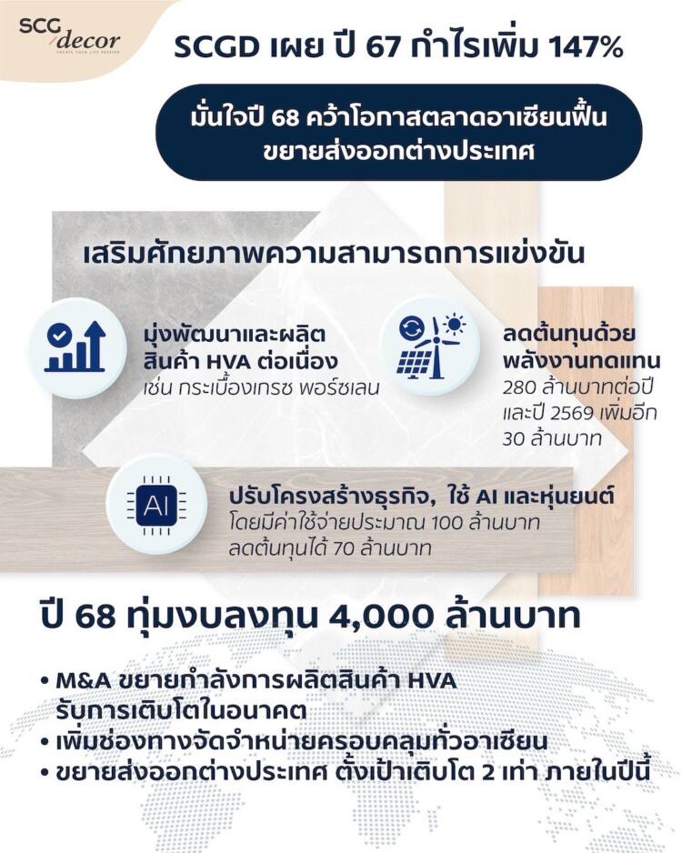 กรุงเทพ ฯ : 29 มกราคม 2568 – SCGD เผยผลประกอบการปี 2567 กำไร 810 ล้านบาท เพิ่มขึ้น 147% สวนกระแสตลาดอาเซียนชะลอตัวจากการปรับโครงสร้างธุรกิจ-กระบวนการผลิต เสริมศักยภาพการแข่งขันโดย 1.) พัฒนาและผลิตสินค้ามูลค่าเพิ่มต่อเนื่อง 2.) ลงทุนพลังงานทดแทนเพื่อลดต้นทุน 3.) ใช้เทคโนโลยี AI และหุ่นยนต์ ปี 2568 พร้อมรับตลาดอาเซียนฟื้น ตั้งงบลงทุน 4,000 ล้านบาท ขยายกำลังการผลิตสินค้า HVA เพิ่มช่องทางจำหน่ายทั่วอาเซียน และลุยส่งออกต่างประเทศ ตั้งเป้ารายได้โต 5% จ่ายปันผลต่อเนื่อง