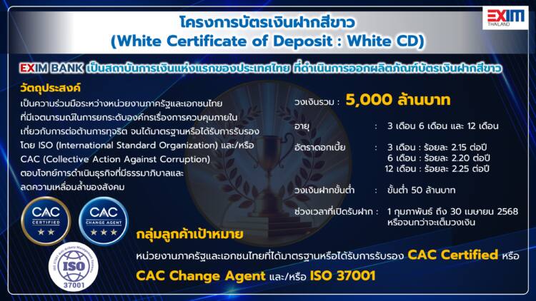 ในโอกาสนี้ EXIM BANK เปิดตัวบัตรเงินฝากสีขาวและสินเชื่อสีขาวที่เรียกว่า “White Certificate of Deposit” และ “White EX” ตามลำดับ ซึ่งนับเป็นผู้นำนวัตกรรมทางการงเงินด้าน Governance แห่งแรกของโลก โดยมีเป้าหมายเพื่อส่งเสริมมาตรฐานการกำกับดูแลภายในองค์กร โดยเฉพาะด้านการต่อต้านคอร์รัปชันและความโปร่งใสทางธุรกิจ โดยมีกลุ่มเป้าหมายเป็นหน่วยงานภาครัฐและภาคเอกชนของไทยที่ได้มาตรฐานหรือการรับรอง โดย ISO หรือ CAC