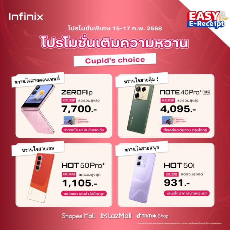พิเศษเมื่อซื้อสมาร์ทโฟนรุ่น GT 20 Pro 5G, NOTE 40 Pro+ 5G, ZERO Flip และ ZERO 40 5G รับฟรี New Year Gift Box มูลค่า 990 บาท จะช้อปเป็นของขวัญให้ตัวเองหรือซื้อเป็นของขวัญช่วงวันวาเลนไทน์นี้ก็มีแต่คุ้ม พร้อมเก็บโค้ดส่วนลดจากอินฟินิกซ์และส่วนลดพิเศษจากแพลตฟอร์มและสามารถนำใบเสร็จรับเงินอิเล็กทรอนิกส์ เพื่อใช้ลดหย่อนภาษีกับโครงการ Easy E-Receipt 2.0 ได้อีกด้วย โปรดีของแถมแน่น จำกัดสิทธิ์เฉพาะในช่วงโปรโมชั่นวันที่ 15 – 17 กุมภาพันธ์ 2568 นี้ เท่านั้น ไปช้อปกันได้ที่ Infinix Official Store ทั้ง 3 ช่องทาง ได้แก่ Shopee: https://cutt.ly/Ze5hPxds Lazada: https://s.lazada.co.th/a.Zw9u และTikTok Shop: https://cutt.ly/se5hPD52 พร้อมกับส่วนลดพิเศษเฉพาะในไลฟ์เท่านั้น