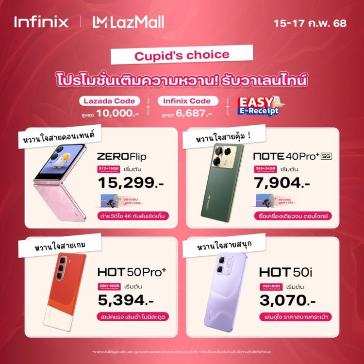 กรุงเทพฯ 13 กุมภาพันธ์ 2568 – Infinix (อินฟินิกซ์) แบรนด์สมาร์ทโฟนระดับโลกราคาคุ้มค่า ครบครันทุกการใช้งาน และตอบโจทย์ไลฟ์สไตล์คนรุ่นใหม่ มอบโปรโมชันต้อนรับเดือนแห่งความรัก ด้วยของขวัญสุดพิเศษให้ตัวเองหรือคนที่คุณรัก นำขบวนด้วย HOT 50 Pro+ Series ที่สายหวานรับวาเลนไทน์ต้องไม่พลาดรุ่นนี้ เพราะมาพร้อมสีชมพู Blossom Pink ที่เหมาะเป็นของแทนใจสุดพิเศษ ในราคาเริ่มต้นเพียง 5,399 บาท หรือจะเป็นรุ่นเล็ก HOT 50 ในราคา 3,581 บาท และ HOT 50i เริ่มต้นเพียง 2,735 บาท ส่วนสายเล่นเกมต้องเกมมิ่งโฟนตัวท็อปกับรุ่น GT 20 Pro 5G สัมผัสประสบการณ์เล่นเกมแบบไร้ขีดจำกัด ด้วยชิปเซ็ตทรงพลัง เริ่มต้นที่ 9,786 บาท ส่วนสายเน้นฟีเจอร์ต้อง NOTE 40 Pro+ 5G สเปกจัดเต็มชาร์จไว เริ่มต้นเพียง 7,999 ต่อ ด้วยสมาร์ทโฟนดีไซน์พรีเมียมเอาใจสายคอนเทนต์จาก ZERO Series กับ ZERO Flip เริ่มต้นเพียง 15,299 บาท และ ZERO 40 5G เริ่มต้นเพียง 10,176 บาท และรุ่นเล็กเหมาะเป็นของขวัญให้คนที่คุณรัก Smart 9 เริ่มต้นเพียง 2,043 บาท เท่านั้น ปิดท้ายแบบเล่นใหญ่กับแลปท็อปตัวแรง GTBOOK GL613 i5 ที่เริ่มต้นเพียง 25,990 บาท รับฟรี GT Book Boxset มูลค่า 1,999.-
