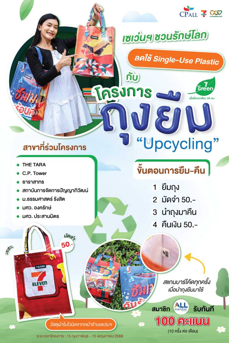 พิเศษสุด ๆ เพราะเป็นถุงยืมที่ Upcycling ทำจากผ้าใบไวนิลหน้าร้านเซเว่นฯ มัดจำเพียง 50 บาท!! และเมื่อนำถุงผ้ามาคืน จะได้เงินคืน 50 บาท นอกจากนี้ทุก ๆ ครั้งที่ใช้ถุงยืมมาซื้อสินค้าภายในร้านเซเว่นฯ รับคะแนน ALL MEMBER ทันที 100 แต้ม (10 ครั้ง/เดือน)