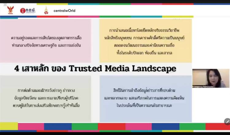 “เป้าหมายสุดท้าย โทรทัศน์อาจไม่ใช่ public sphere ภาพเดิมแบบที่เราเคยเห็น เป็นพื้นที่แห่งการสร้าง public opinion ที่เป็นเหตุเป็นผล เคารพสิทธิ์ทุกคน คนจากทุกภาคส่วนมีส่วนร่วมสร้างพื้นที่สาธารณะได้ แต่อย่างน้อยเป้าหมายที่ กสทช.ด้านกิจการโทรทัศน์มองคือทำอย่างไร ให้โทรทัศน์ที่เป็นโทรทัศน์ของประเทศเป็นพื้นที่ที่ trusted มากขึ้น เชื่อถือได้ ไว้ใจได้ เราต้องเสริมแรงในทางเศรษฐกิจให้กิจการโทรทัศน์อยู่ได้ ในขณะเดียวกันเรื่องจริยธรรม การแก้ปัญหา การเฝ้าระวัง disinformation เพิ่มการรู้เท่าทันสื่อและการส่งเสริมสิทธิของผู้ที่เกี่ยวข้องโดยเฉพาะในภาคประชาชนต่างๆ เป็นสี่เสาหลักที่เราตั้งเป้าให้โทรทัศน์ไทยได้ไปต่อและไปถึง” กสทช.ด้านกิจการโทรทัศน์ กล่าว