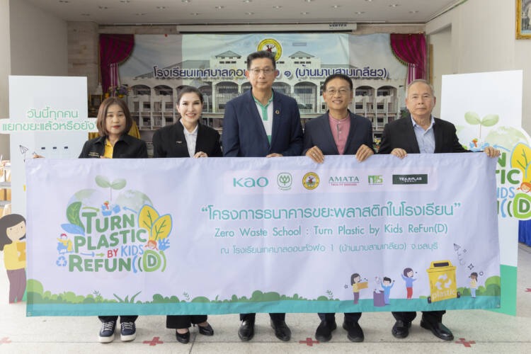 เมื่อเร็วๆ นี้ นายสุทธิพงค์ ลิ่มศิลา หัวหน้าฝ่ายกลยุทธ์องค์กร บริษัท คาโอ อินดัสเตรียล (ประเทศไทย) จำกัด (กลาง) และนางศิริพร เดชสิงห์ ประธานเจ้าหน้าที่บริหาร สายงานความยั่งยืนและสื่อสารองค์กร บริษัท ซีพี แอ็กซ์ตร้า จำกัด (มหาชน) ในฐานะผู้แทนเครือเจริญโภคภัณฑ์ (ซีพี) (ที่ 2 จากซ้าย) พร้อมพันธมิตรภาครัฐและเอกชน ได้แก่ นายอัครเรศร์ ชูช่วย กรรมการผู้จัดการ บริษัท อมตะ ฟาซิลิตี้ เซอร์วิส จำกัด (ที่ 2 จากขวา), นายสุรพงษ์ อติชาดศรีสกุล กรรมการผู้จัดการบริษัท ทีมพลาส เคมีคอล จำกัด (ขวาสุด) และ นางสาวสุพิชฌาย์ ปานผดุง รองนายกเทศมนตรี ตำบลดอนหัวฬ่อ (ซ้ายสุด) ร่วมเปิดโครงการ Zero Waste School : Turn Plastic by Kids Refun(D) จัดตั้งธนาคารขยะพลาสติกในโรงเรียน เพื่อมุ่งปลูกจิตสำนึกเด็กไทยรู้คุณค่าขยะรีไซเคิล ร่วมกันลดขยะ และนำขยะพลาสติกเหล่านั้นกลับมาปฏิรูปใช้ใหม่ให้เกิดประโยชน์สูงสุด โดยริเริ่มโครงการ ณ โรงเรียนเทศบาลดอนหัวฬ่อ 1 (บ้านมาบสามเกลียว) เป็นแห่งแรก เพื่อเป็นโมเดลในการจัดการขยะพลาสติกในชุมชนโดยมีโรงเรียนเป็นสื่อกลางและขยายผลไปยังโรงเรียนหรือในชุมชนอื่นต่อไป