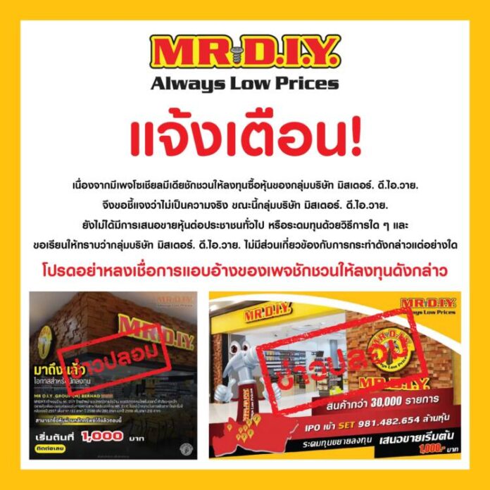กรุงเทพฯ, 11 มีนาคม 2568 – บริษัท มิสเตอร์. ดี.ไอ.วาย. โฮลดิ้ง (ประเทศ) จำกัด (มหาชน) (“บริษัทฯ”) ผู้นำธุรกิจค้าปลีกอุปกรณ์ตกแต่งบ้านและสินค้าไลฟ์สไตล์ แจ้งเตือนประชาชนให้ระมัดระวังการหลอกลวงในรูปแบบการชักชวนลงทุนจองซื้อหุ้นของบริษัทฯ ผ่านโซเชียลมีเดีย เนื่องจากขณะนี้มีผู้หลงเชื่อเป็นจำนวนมาก