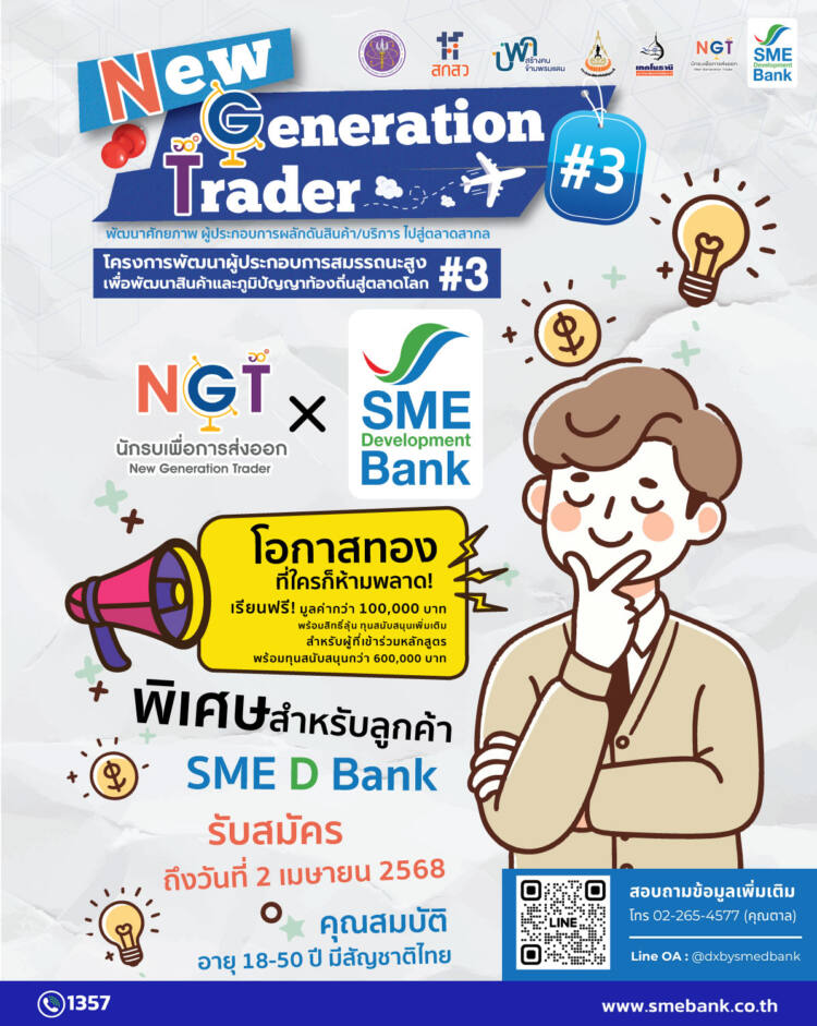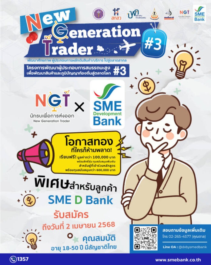 14มี.ค.2568/ ธนาคารพัฒนาวิสาหกิจขนาดกลางและขนาดย่อมแห่งประเทศไทย (ธพว.) หรือ SME D Bank มุ่งมั่นภารกิจธนาคารเพื่อการพัฒนาผู้ประกอบการเอสเอ็มอี ผนึกกำลังหน่วยงานพันธมิตรต่างๆ นำโดยกระทรวงการอุดมศึกษาวิทยาศาสตร์ วิจัย และนวัตกรรม (อว.)  และมหาวิทยาลัยเทคโนโลยีสุรนารี   เดินหน้าโครงการ “New Generation Trader#3” หรือ NGT3  เปิดรับสมัครคนรุ่นใหม่ ทั้งกลุ่มนักเรียน นักศึกษา ตลอดจนผู้ประกอบการเอสเอ็มอี อายุตั้งแต่ 18-50 ปี  เข้ารับการพัฒนาเพิ่มศักยภาพ และเตรียมความพร้อม สำหรับผลักดันสินค้าหรือบริการของตัวเองไปสู่การส่งออกตลาดต่างประเทศ ซึ่งเป็นความรู้ที่จำเป็นและสำคัญต่อการทำตลาดส่งออก อบรมโดยวิทยากรชื่อดังมากมาย มูลค่ากว่า 100,000 บาท