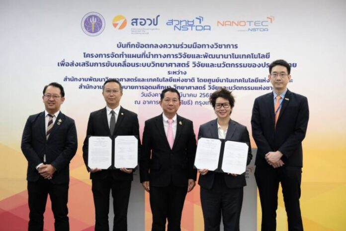 สำนักงานพัฒนาวิทยาศาสตร์และเทคโนโลยีแห่งชาติ (สวทช.) โดยศูนย์นาโนเทคโนโลยีแห่งชาติ (นาโนเทค) ภายใต้ กระทรวงการอุดมศึกษา วิทยาศาสตร์ วิจัยและนวัตกรรม (อว.) และ สำนักงานสภานโยบายการอุดมศึกษา วิทยาศาสตร์ วิจัยและนวัตกรรมแห่งชาติ (สอวช.) ลงนามความร่วมมือโครงการจัดทำ “แผนที่นำทางการวิจัยและพัฒนานาโนเทคโนโลยีของประเทศไทย พ.ศ. 2569 – 2573” ส่งเสริมการขับเคลื่อนระบบวิทยาศาสตร์ วิจัยและนวัตกรรม (ววน.) ของประเทศ และสร้างเครือข่ายด้านนาโนเทคโนโลยี นำร่อง 4 ประเด็นมุ่งเน้น คือ การแพทย์และสุขภาพมูลค่าสูง, พลังงานสีเขียวและการเปลี่ยนแปลงสภาพภูมิอากาศ, เกษตรอาหารเพื่อความยั่งยืน และความปลอดภัยนาโนเทคโนโลยี (Nanosafety) ตั้งเป้ายกระดับผลงานวิจัยสู่การใช้งานจริงในทุกภาคส่วน
