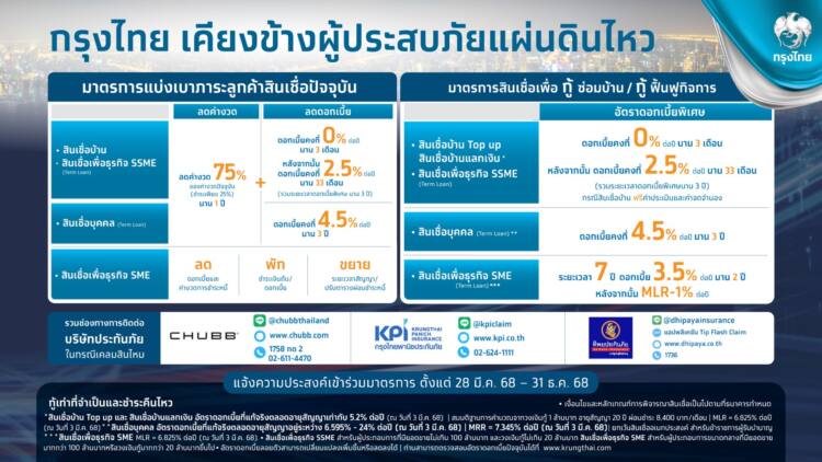 ธนาคารกรุงไทย มีความห่วงใยลูกค้าและประชาชน ที่ได้รับผลกระทบจากเหตุการณ์แผ่นดินไหว เร่งออกมาตรการช่วยเหลือทางการเงิน เพื่อบรรเทาความเดือดร้อนให้กับลูกค้าบุคคลรายย่อย ผู้ประกอบการเอสเอ็มอี   และลูกค้าธุรกิจ มุ่งเน้นช่วยลดภาระทางการเงิน ครอบคลุมการลดดอกเบี้ย และลดค่างวดชำระหนี้ พร้อมเสริมสภาพคล่องในการดำรงชีพ และซ่อมแซมทรัพย์สินที่ได้รับความเสียหาย