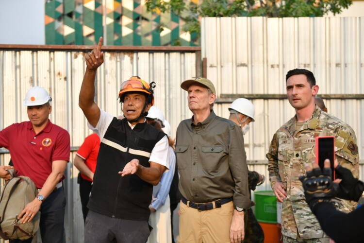 1เม.ย.2568 / นายชัชชาติ สิทธิพันธุ์ ผู้ว่าราชการกรุงเทพมหานคร แถลงข่าวความคืบหน้าการกู้ภัยอาคารถล่มจากสถานการณ์แผ่นดินไหวในพื้นที่เขตจตุจักร ณ ศูนย์บัญชาการเหตุการณ์จตุจักร ว่า เราค้นหาผู้ประสบภัยอย่างต่อเนื่อง โดยขยับอีกระยะหนึ่งคือ การรื้อถอนสิ่งที่หักพังขนาดใหญ่ออก โดยเริ่มตั้งแต่เมื่อคืน มีการวางแผนกันตอน 6 โมงเย็น โดยทีมกู้ภัยนานาชาติ ซึ่งเป็นทีมที่มีความเชี่ยวชาญ มีประสบการณ์ เป็นระดับที่เรียกได้ว่าเป็น heavy คือเป็นทีมที่ดีที่สุดในโลก เมื่อคืนมีการติดตั้งเครนทั้งหมด 4 ตัว มี 600 ตันหนึ่งตัว ส่วนทางด้านซ้าย 500 ตัน ตรงกลาง 200 ตัน อีก 2 ตัวประกอบกัน เช้านี้เริ่มยกตั้งแต่เวลา 08.00 น. ซึ่งถือว่าทำได้เร็ว เพราะว่าการยกเครนไม่ใช่เรื่องง่าย ต้องยกทีละชิ้น โดยมีการกำหนดจุดจากผู้เชี่ยวชาญ เมื่อเช้านี้มีทั้งหมด 4 จุด แล้วก็ยกออกเสร็จตามกำหนดภายในเที่ยงวัน จากนั้นก็ทยอยยกอีก 67 ชิ้น