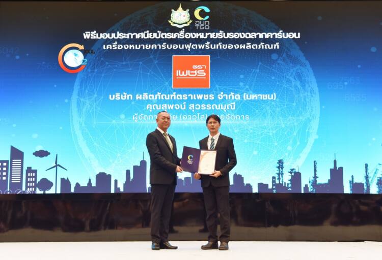 นายสุพจน์ สุวรรณมุณี (ขวา) ผู้จัดการฝ่าย (อาวุโส) บริษัท ผลิตภัณฑ์ตราเพชร จำกัด (มหาชน) หรือ DRT รับมอบประกาศนียบัตรเครื่องหมายรับรองฉลากคาร์บอน ประเภทเครื่องหมายคาร์บอนฟุตพริ้นท์ของผลิตภัณฑ์ (Carbon Footprint of Product: CFP) จาก ดร.เฉลิมชัย ศรีอ่อน รัฐมนตรีว่าการกระทรวงทรัพยากรธรรมชาติและสิ่งแวดล้อม ประธานในพิธีมอบประกาศนียบัตรฉลากคาร์บอน ที่จัดโดยองค์การบริหารจัดการก๊าซเรือนกระจก (องค์การมหาชน: อบก.) โดยบริษัทฯ มีผลิตภัณฑ์ที่ได้รับการขึ้นทะเบียนเครื่องหมายคาร์บอนฟุตพริ้นท์ 8 ผลิตภัณฑ์ ได้แก่ กระเบื้องหลังคาคอนกรีต CT เพชร และอดามัส, กระเบื้องหลังคาไฟเบอร์ซีเมนต์ลอนคู่ และจตุลอน รุ่นไม่มีใยหิน, อิฐมวลเบา, โครงหลังคาสำเร็จรูป D-Truss, ไดมอนด์บอร์ด และไม้เชิงชายพลัส สำหรับประกาศนียบัตรครื่องหมายรับรองฉลากคาร์บอนฟุตพริ้นท์ของผลิตภัณฑ์ทั้ง 8 ผลิตภัณฑ์นี้ ได้สะท้อนถึงเจตนารมณ์และความมุ่งมั่นลดการปล่อยก๊าซเรือนกระจก ตามแนวทางการพัฒนาอย่างยั่งยืน เพื่อส่งเสริมผู้บริโภคมีส่วนร่วมลดผลกระทบต่อสิ่งแวดล้อมและขับเคลื่อนประเทศไทยสู่สังคมคาร์บอนต่ำ โดยงานดังกล่าวจัดขึ้น ณ สถาบันเพื่อการยุติธรรมแห่งประเทศไทย กรุงเทพฯ เมื่อเร็วๆ นี้