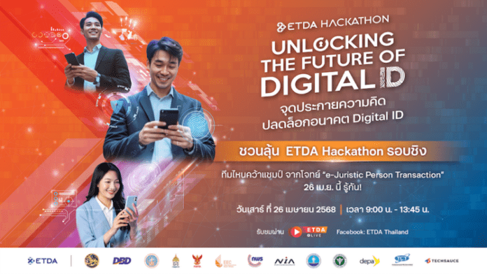 โดยกิจกรรม ETDA Hackathon: Unlocking the Future of Digital ID ภายใต้โจทย์ที่ 1 “e-Juristic Person Transaction” รอบชิงชนะเลิศ เตรียมจัดขึ้นในวันที่ 26 เมษายน 2568 ณ House Samyan โรงหนังที่ 4 สามย่านมิตรทาวน์ ชั้น 5 โดยความร่วมมือระหว่าง ETDA และพาร์ทเนอร์สำคัญ ได้แก่ กรมการปกครอง, กรมพัฒนาธุรกิจการค้า (DBD), กรมสรรพากร, กรมศุลกากร, สำนักงานคณะกรรมการกิจการกระจายเสียง กิจการโทรทัศน์ และกิจการโทรคมนาคมแห่งชาติ (กสทช.), สำนักงานคณะกรรมการนโยบายเขตพัฒนาพิเศษภาคตะวันออก (สกพอ.), สํานักงานคณะกรรมการพัฒนาระบบราชการ (กพร.), สำนักงานนวัตกรรมแห่งชาติ (NIA),สํานักงานปลัดกระทรวงการท่องเที่ยวและการกีฬา, สำนักสุขภาพดิจิทัล สำนักงานปลัดกระทรวงสาธารณสุข, สำนักงานส่งเสริมเศรษฐกิจดิจิทัล (depa), สำนักงานตรวจคนเข้าเมือง, สมาคมโทรคมนาคมแห่งประเทศไทยในพระบรมราชูปถัมภ์และ บริษัท เทคซอส มีเดีย จำกัด