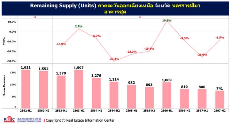 จากการที่ภาพรวมภาคตะวันออกเฉียงเหนือ 5 จังหวัดมีที่อยู่อาศัยเหลือขายในช่วงครึ่งหลังปี 2567 มีจำนวน 12,855 หน่วยเพิ่มขึ้นร้อยละ 10.3 มูลค่า 45,914 ล้านบาท เพิ่มขึ้นร้อยละ 5.2 เมื่อเทียบกับช่วงเดียวกันของปี 2566 (YoY) ในจำนวนดังกล่าวเป็นโครงการบ้านจัดสรรจำนวน 9,290 หน่วย มูลค่า 36,094 ล้านบาท และเป็นโครงการอาคารชุด 3,565 หน่วย มูลค่า 9,820 ล้านบาท โดยจังหวัดนครราชสีมา เป็นจังหวัดที่มีบ้านแนวราบเหลือขายสูงสุดถึง 4,147 หน่วย มูลค่า 16,222 ล้านบาท รองลงมาคือจังหวัดขอนแก่น มีจำนวน 2,780 หน่วย มูลค่า 11,606 ล้านบาท ขณะที่จังหวัดขอนแก่นมีจำนวนหน่วยอาคารชุดเหลือขายสูงสุดจำนวน 2,223 หน่วย มูลค่า 4,713 ล้านบาท ในขณะที่จังหวัดนครราชสีมามีจำนวนอาคารชุดเหลือขายเพียง 741 หน่วยเท่านั้น แต่มีมูลค่าอาคารชุดเหลือขายสูงถึง 3,772 ล้านบาท