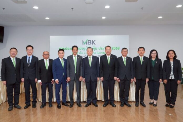 บริษัท เอ็ม บี เค จำกัด (มหาชน) จัดการประชุมสามัญผู้ถือหุ้ นประจำปี 2568 นำโดย นายบันเทิง ตันติวิท ประธานกรรมการ และ ประธานกรรมการกำกับดูแลกิ จการและความยั่งยืน และ นายศุภเดช พูนพิพัฒน์ รองประธานกรรมการ ประธานกรรมการบริหาร ประธานกรรมการสรรหาและพิจารณาค่ าตอบแทน และกรรมการกำกับดูแลกิ จการและความยั่งยืน ประชุมผ่านช่องทางออนไลน์ พร้อมด้วย นายสุเวทย์ ธีรวชิรกุล รองประธานกรรมการบริหาร (ที่ 6 จากซ้าย) นายวิจักษณ์ ประดิษฐวณิช ประธานเจ้าหน้าที่บริ หารและกรรมการผู้อำนวยการ (ที่ 7 จากซ้าย) รวมทั้งคณะกรรมการและผู้บริหาร บริษัท เอ็ม บี เค จำกัด (มหาชน) ที่เข้าร่วมประชุมที่บริษั ทและผ่านสื่ออิเล็กทรอนิกส์ โดยที่ประชุมมีมติอนุมัติจ่ ายเงินปันผลงวดผลการดำเนิ นงานประจำปี 2567 ในอัตราหุ้นละ 0.50 บาท ณ ห้องสัมมนา ชั้น 8 อาคารเอ็ม บี เค เซ็นเตอร์ เมื่อเร็ว ๆ นี้