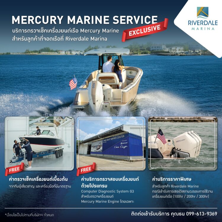 ริเวอร์เดล มารีน่า ธุรกิจเรือแบบครบวงจรภายใต้ บริษัท พี อาร์ จี คอร์ปอเรชั่น จำกัด (มหาชน) ในเครือเอ็ม บี เค ร่วมกับบริษัท เอ็มจีซี มารีน แอนด์ ชาร์เตอร์ (เอเชีย) จำกัด ตัวแทนผู้ให้บริการ เครื่องยนต์เรือ Mercury Marine Engine อย่างเป็นทางการ จัดโปรโมชันสุดลักซ์ชัวรี สำหรับลูกค้าที่มีเครื่องยนต์