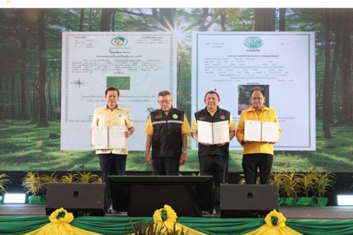 นายณรงค์ ขันติวิริยะกุล รองผู้จัดการ ธนาคารเพื่อการเกษตรและสหกรณ์การเกษตร (ธ.ก.ส.) ร่วมงาน “Kick Off มอบโฉนดต้นไม้และโฉนดต้นยางพารา” และร่วมลงนามแสดงเจตจำนงร่วมกันใน “การขับเคลื่อนนโยบายโฉนดต้นไม้และโฉนดต้นยางพาราสู่แหล่งทุน” ระหว่าง ธ.ก.ส. สำนักงานการปฏิรูปที่ดินเพื่อเกษตรกรรม (ส.ป.ก.) และการยางแห่งประเทศไทย (กยท.) โดยการขับเคลื่อนนโยบายดังกล่าว เพื่อสนับสนุนการพัฒนาคุณภาพชีวิตเกษตรกรและเปิดโอกาสในการขอรับบริการสินเชื่อจาก ธ.ก.ส. โดยใช้ต้นไม้และต้นยางพาราเป็นหลักประกันทำให้เกษตรกรสามารถใช้ประโยชน์จากการนำต้นไม้มาแปลงมูลค่าเป็นสินทรัพย์และนำมาใช้เป็นหลักประกันขอสินเชื่อ ซึ่งนอกจากเป็นการเพิ่มมูลค่าที่ดินแล้ว ยังสามารถนำไม้ไปใช้ประโยชน์อื่น ๆ เช่น ขายไม้ไปทำเฟอร์นิเจอร์ และนำไม้เข้าร่วมโครงการ BAAC Carbon Credit สร้างรายได้ และลดปัญหาโลกร้อน รวมถึงการลดภาษี อันเป็นการเพิ่มมูลค่าที่ดินในอนาคต ซึ่งสอดคล้องกับนโยบายของรัฐบาลที่ต้องการให้ประชาชนสามารถใช้ประโยชน์จากสินทรัพย์สร้างโอกาส สร้างรายได้สู่ความมั่นคงในชีวิต