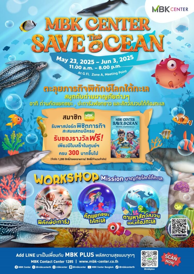 ศูนย์การค้าเอ็ม บี เค เซ็นเตอร์ ใส่ใจสิ่งแวดล้อม เนรมิตพื้นที่เป็นอาณาจักรท้ องทะเลสวยงามให้น้อง ๆ หนู ๆ แปลงร่างเป็นผู้พิทักษ์ตัวจิ๋ วตะลุยภารกิจพิทักษ์โลกใต้ทะเล ในงาน MBK CENTER SAVE THE OCEAN ระหว่างวันศุกร์ที่ 23 พฤษภาคม – วันอังคารที่ 3 มิถุนายน 2568 บริเวณ Meeting Point ชั้น G โซน A ตั้งแต่เวลา 11.00 น. – 20.00 น.
