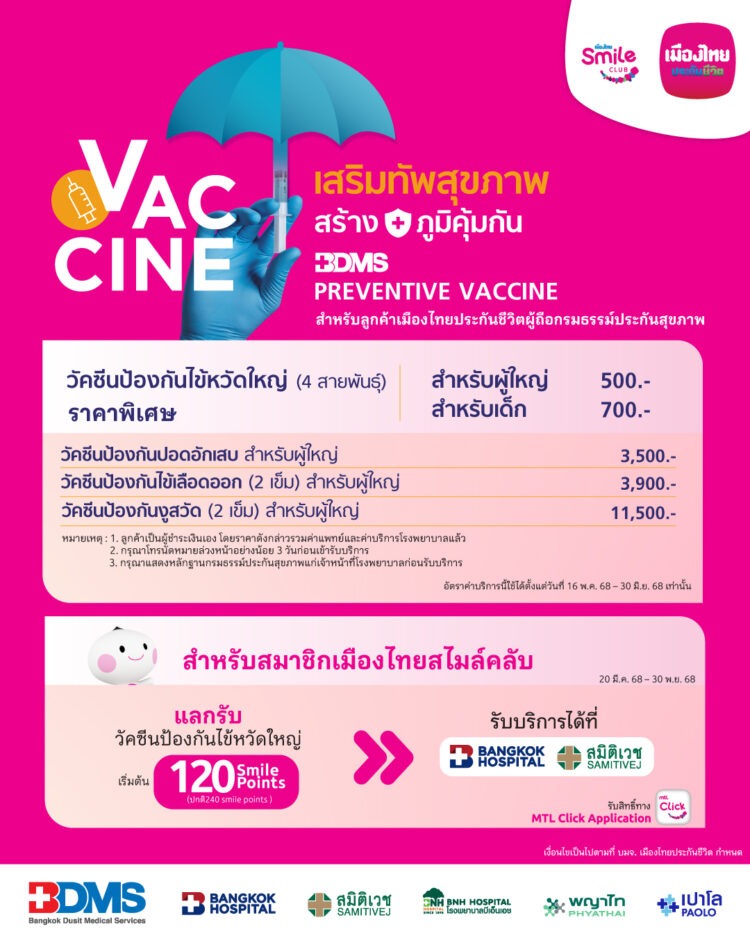 นอกจากนี้  เมืองไทยประกันชีวิตยังได้ร่วมแคมเปญ “BDMS PREVENTIVE VACCINE”  มอบสิทธิพิเศษสำหรับผู้ถือกรมธรรม์ประกันสุขภาพ รับวัคซีนในราคาสุดพิเศษ (รวมค่าแพทย์) ครอบคลุม 4 กลุ่มโรคหลัก ได้แก่ วัคซีนป้องกันโรคไข้หวัดใหญ่ 4 สายพันธุ์ สำหรับผู้ใหญ่ราคา 500 บาท และเด็ก ราคา 700 บาท วัคซีนป้องกันโรคปอดอักเสบ   สำหรับผู้ใหญ่ ราคา 3,500 บาท วัคซีนป้องกันโรคไข้เลือดออกสำหรับผู้ใหญ่  (2 เข็ม) รวมราคา 3,900 บาท และวัคซีนป้องกันโรคงูสวัดสำหรับผู้ใหญ่ (2 เข็ม) รวมราคา 11,500 บาท โดยผู้ถือกรมธรรม์ประกันสุขภาพของเมืองไทยประกันชีวิต สามารถแสดงหลักฐานเพื่อเข้ารับบริการได้     ณ โรงพยาบาลในเครือ BDMS  ทั่วประเทศ ตั้งแต่วันที่ 16 พฤษภาคม 2568 – 30 มิถุนายน 2568  โดยผู้ที่สนใจสามารถสอบถามรายละเอียดเพิ่มเติม ได้ที่โรงพยาบาลในเครือ BDMS ทั่วประเทศ