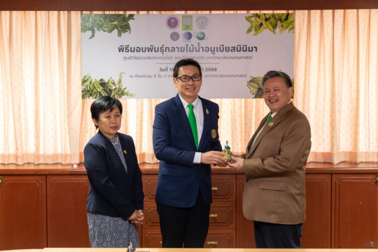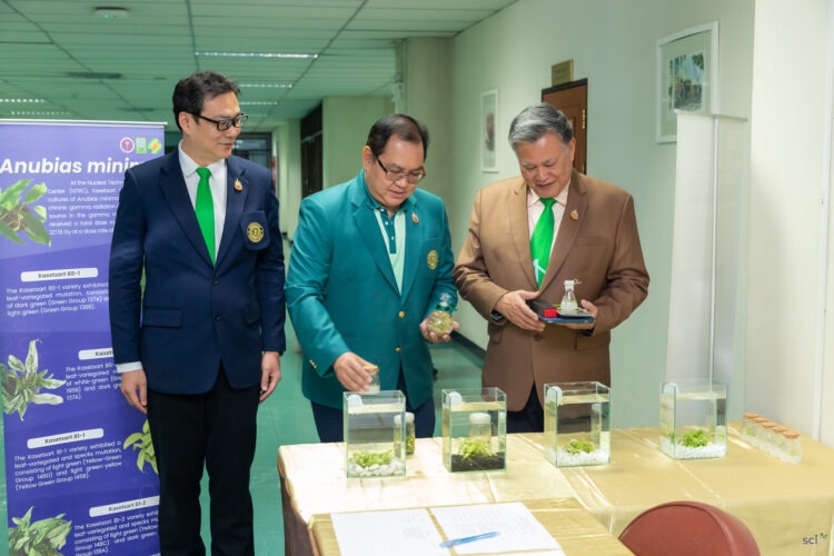 เมื่อวันที่ 19 มิถุนายน พ.ศ.2568 ณ ห้องประชุม 9 ชั้น 2 อาคารสารนิเทศ 50 ปี มหาวิทยาลัยเกษตรศาสตร์ ดร.ดำรงค์ ศรีพระราม รักษาการแทนอธิการบดีมหาวิทยาลัยเกษตรศาสตร์ เป็นประธานในพิธีมอบพันธุ์กลายไม้น้ำ “อนูเบียส มินิมา” 4 พันธุ์แรกจากการเหนี่ยวนำให้กลายพันธุ์ด้วยรังสีแกมมา ที่ได้รับการรับรองพันธุ์พืชขึ้นทะเบียน จากสำนักคุ้มครองพันธุ์พืช กรมวิชาการเกษตร ซึ่งเป็นผลงานวิจัยของ รศ.ดร.พีรนุช จอมพุก และทีมงาน จากโครงการวิจัยการใช้ประโยชน์เทคโนโลยีนิวเคลียร์เพื่อพัฒนาศักยภาพการผลิตไม้ดอกไม้ประดับ : การปรับปรุงพันธุ์โดยการเหนี่ยวนำให้กลายพันธุ์ด้วยรังสีแกมมา จากต้นกำเนิดรังสีซีเซียม-137 ให้แก่ เพื่อนำไปใช้เป็นประโยชน์ในการศึกษาวิจัยและส่งเสริมการกระจายพันธ์สู่เกษตรกรผู้เพาะเลี้ยงไม้น้ำรวมถึงผู้ประกอบการ