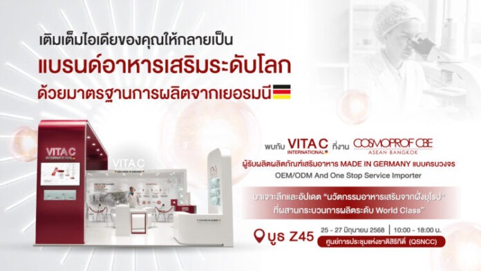 เตรียมพบกับสุดยอดนวัตกรรมจากผู้นำด้านการผลิตผลิตภัณฑ์เสริมอาหาร บริษัท วิตาซี อินเตอร์เนชั่นแนล จำกัด ในงาน Cosmoprof CBE ASEAN 2025 งานแสดงสินค้าเพื่อธุรกิจความงามระดับโลก ที่จุดประกายไอเดียและเชื่อมต่อธุรกิจความงามนานาชาติ โดย วิตาซี อินเตอร์เนชั่นแนล ขนทัพสุดยอดนวัตกรรมผลิตภัณฑ์เสริมอาหารจากประเทศเยอรมนี ที่ผลิตภายใต้เทคโนโลยีการผลิตที่ทันสมัย จากโรงงานผู้ผลิตระดับเวิลด์คลาสที่เปิดดำเนินกิจการมายาวนานกว่า 50 ปี เพื่อมาสร้างจุดแข็งที่แตกต่างให้กับนักธุรกิจที่ต้องการสร้างแบรนด์ผลิตภัณฑ์เสริมอาหารให้เติบโตอย่างยั่งยืนในตลาด และพร้อมตอบสนองความต้องการด้านสุขภาพของกลุ่มเป้าหมายได้อย่าง “ตรงโจทย์”