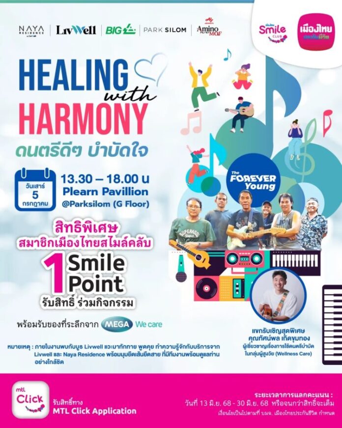 บริษัท เมืองไทยประกันชีวิต จำกัด (มหาชน) โดย “เมืองไทยสไมล์คลับ” เดินหน้าส่งมอบความสุขและรอยยิ้มให้สมาชิกเมืองไทย สไมล์คลับและครอบครัว ชวนร่วมงาน “Healing with Harmony” ดนตรีดีๆ บำบัดใจ กับกิจกรรมพิเศษเพื่อสุขภาพใจและกายสำหรับผู้สูงวัย จัดโดย LivWell ในวันเสาร์ที่ 5 กรกฎาคม 2568 เวลา 13.30 – 18.00 น. ณ Plearn Pavillion @Park Silom (G Floor)
