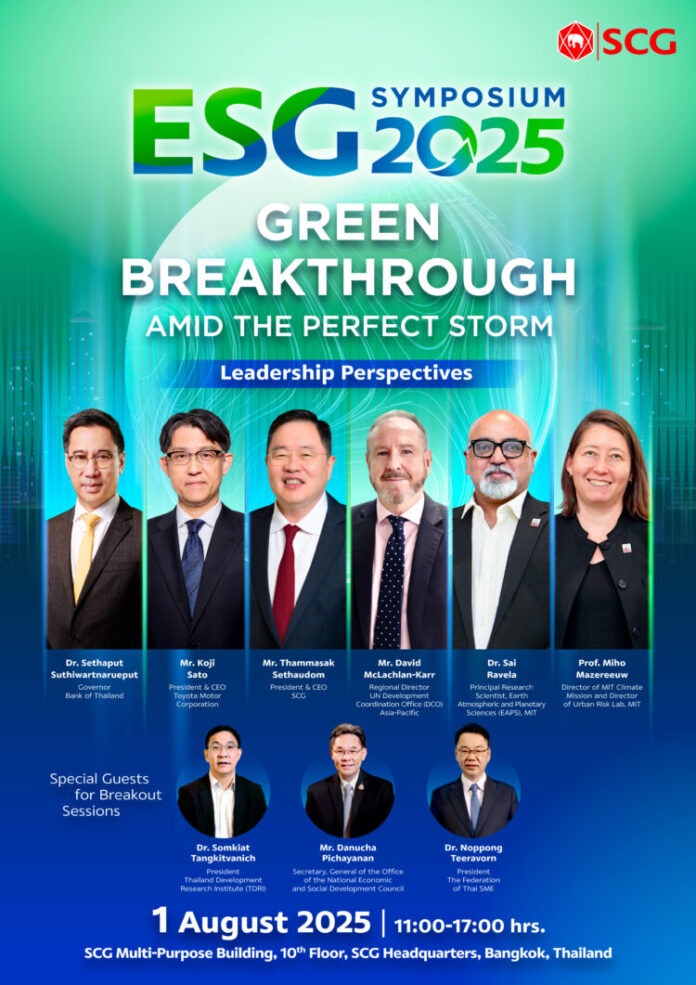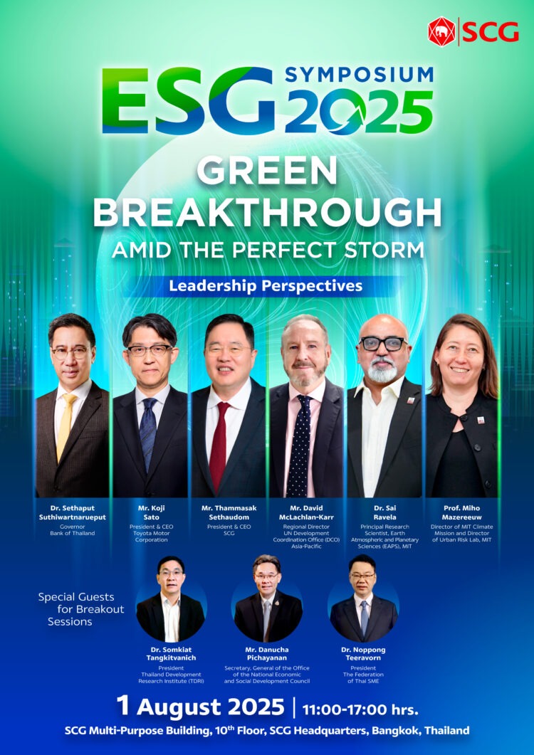 ดังนั้น เอสซีจี จึงจัดงาน ESG Symposium 2025 ภายใต้ธีม “Green Breakthrough amid the Perfect Storm – เร่งด้วยกรีน รอดด้วยกัน” ในวันที่ 1 สิงหาคม 2025 เวลา 11:00–17:00 น. ณ สำนักงานใหญ่ เอสซีจี บางซื่อ โดยเวทีนี้เป็นพื้นที่สำหรับผู้นำจากหลากหลายภาคส่วนที่มีบทบาทในการขับเคลื่อนการเปลี่ยนผ่านของอาเซียน มาร่วมแลกเปลี่ยนมุมมอง ร่วมกันระดมสมอง และหาข้อเสนอในการขับเคลื่อนสังคมคาร์บอนต่ำ