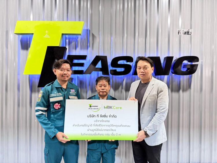 นายพงศภัค เจริญภักดีไทย ผู้อำนวยการฝ่ายการตลาดเช่าซื้อกรุงเทพฯ 2 (ที่ 3 จากซ้าย) บริษัท ที ลีสซิ่ง จำกัด ผู้ให้บริการสินเชื่อเช่าซื้อรถจักรยานยนต์ ในเครือ เอ็ม บี เค มอบเงินบริจาคสมทบทุนจัดซื้อโลงศพ ให้แก่ผู้เสียชีวิตจากอุบัติเหตุบนท้องถนนที่ไร้ญาติและขาดแคลนทุนทรัพย์ ผ่านมูลนิธิแม่นาคพระโขนง (วัดมหาบุษย์) องค์กรจิตอาสาที่ทุ่มเททำงานเพื่อช่วยเหลือผู้ยากไร้ในหลากหลายมิติ สอดคล้องกับความมุ่งมั่นของบริษัทฯ ในการเป็นผู้นำด้านการให้สินเชื่อรายย่อย ที่สนับสนุนการสร้างประโยชน์และพัฒนาคุณภาพชีวิตให้กับชุมชน สังคม และสิ่งแวดล้อม โดยมีตัวแทนมูลนิธิฯ เป็นผู้รับมอบ ณ สำนักงานใหญ่ บริษัท ที ลีสซิ่ง จำกัด ชั้น 3 อาคารพาราไดซ์ เพลส เมื่อเร็ว ๆ นี้