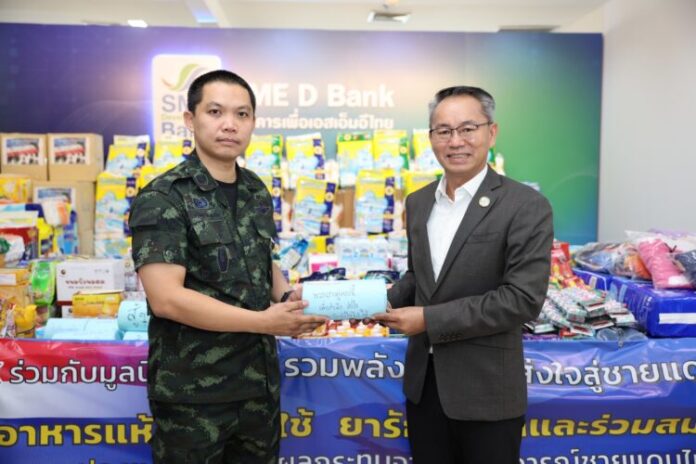 6ส.ค.2568/ นายพิชิต มิทราวงศ์ กรรมการผู้จัดการ ธนาคารพัฒนาวิสาหกิจขนาดกลางและขนาดย่อมแห่งประเทศไทย (ธพว.) หรือ SME D Bank พร้อมด้วยผู้บริหารและเจ้าหน้าที่ ร่วมส่งมอบอาหารแห้ง ของใช้ ยารักษาโรค และสิ่งของจำเป็นต่าง ๆ ที่ได้รับบริจาคจากผู้บริหาร เจ้าหน้าที่ธนาคาร หน่วยงานพันธมิตร ลูกค้าธนาคาร ผู้ประกอบการเอสเอ็มอี และประชาชน ผ่านกิจกรรม “รวมพลังคนไทย ส่งใจสู่ชายแดน” ซึ่ง SME D Bank จับมือกับ มูลนิธิเส้นด้าย เพื่อนำไปมอบให้แก่ประชาชน ทหาร และผู้ปฏิบัติหน้าที่ ในพื้นที่สถานการณ์ความไม่สงบจากเหตุปะทะตามแนวพื้นที่ชายแดนไทย-กัมพูชา ช่วยบรรเทาความเดือดร้อนและนำไปใช้ในชีวิตประจำวัน