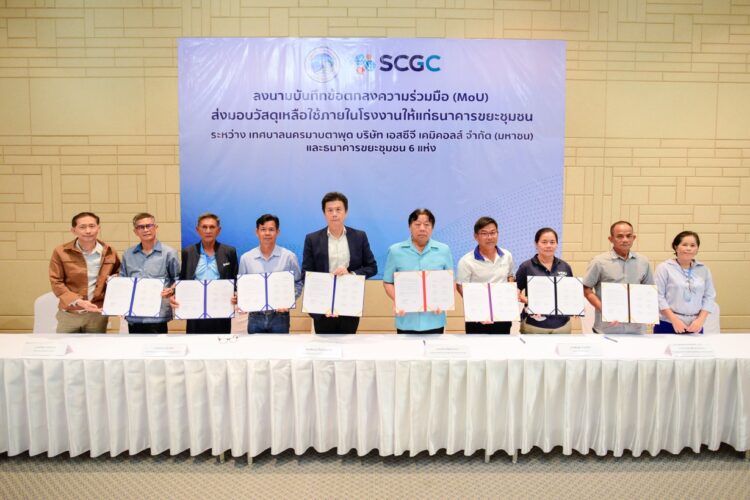 เอสซีจี เคมิคอลส์ หรือ SCGC ร่วมกับเทศบาลนครมาบตาพุด และเครือข่ายธนาคารขยะชุมชน ลงนามบันทึกข้อตกลงความร่วมมือ (MoU) “ส่งมอบวัสดุเหลือใช้ภายในโรงงานให้แก่ธนาคารขยะชุมชน” โดยมีเป้าหมายเพื่อส่งเสริมและสร้างรายได้ให้กับชุมชนด้วยการนำวัสดุเหลือใช้ภายในโรงงานของกลุ่มธุรกิจ SCGC ไปรีไซเคิลเพื่อสร้างมูลค่าเพิ่ม และให้เกิดประโยชน์สูงสุดตามหลักเศรษฐกิจหมุนเวียน (Circular Economy) สอดคล้องกับนโยบายความยั่งยืนของ SCGC ด้าน Low Waste, Low Carbon โดย SCGC จะจัดส่งวัสดุเหลือใช้ภายในโรงงาน อาทิ ขวดพลาสติก ฝาขวด กระป๋อง และขวดแก้ว ให้กับธนาคารขยะชุมชนรวม 6 แห่ง ได้แก่ ธนาคารขยะชุมชนเขาไผ่ ธนาคารขยะรีไซเคิล ชุมชนตลาดมาบตาพุด ธนาคารขยะ อสม. ชุมชนโขดหิน 2 วิสาหกิจชุมชนธนาคารคัดแยกขยะรีไซเคิล ชุมชนวัดชากลูกหญ้า วิสาหกิจชุมชนธนาคารเพื่อสิ่งแวดล้อมชุมชนเนินพยอม และวิสาหกิจชุมชนหนองบัวแดงเพื่อสังคมและสิ่งแวดล้อม โดยมีนายถวิล โพธิบัวทอง นายกเทศมนตรีนครมาบตาพุด ดร.พิเชษฐ์ ตั้งปัญญารัช ผู้ช่วยประธานเจ้าหน้าที่ปฎิบัติการและนวัตกรรม – การจัดการอุตสาหกรรมและความร่วมมือทางธุรกิจ บริษัท เอสซีจี เคมิคอลส์ จำกัด (มหาชน) พร้อมด้วยประธานธนาคารขยะชุมชนทั้ง 6 แห่ง ร่วมลงนามความร่วมมือดังกล่าว