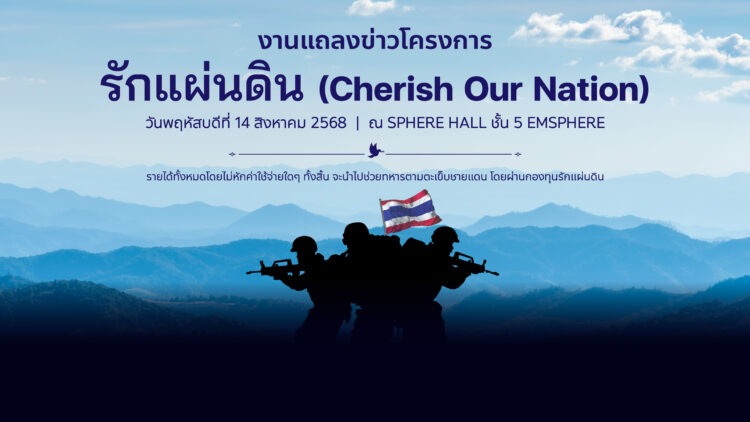 กรุงเทพฯ – ด้วยความตระหนักถึงความเสียสละอันยิ่งใหญ่ของเหล่าทหารไทยที่ปกป้องผืนแผ่นดินด้วยชีวิต และเพื่อแสดงพลังแห่งความรักชาติ หน่วยงานภาคเอกชน กลุ่มศิลปิน ร้านอาหารชั้นนำ และโรงแรมห้าดาว จึงร่วมกันจัดโครงการ “รักแผ่นดิน (Cherish Our Nation)” ภายใต้ความตั้งใจระดมทุนช่วยเหลือครอบครัวของทหารไทยผู้เสียชีวิตจากการปฏิบัติหน้าที่ พร้อมจัดหาอุปกรณ์จำเป็นให้แก่กองทัพไทย โดยมีคุณศุภลักษณ์ อัมพุช ประธานโครงการรักแผ่นดิน และ คุณนันทิยา อินทรลิบ กรรมการโครงการรักแผ่นดิน