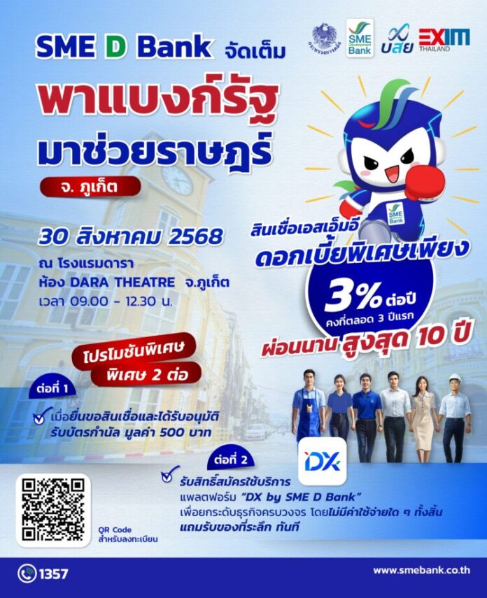 SME D Bank เสิร์ฟใหญ่ในงาน‘พาแบงก์รัฐ มาช่วยราษฎร์’จ.ภูเก็ต สินเชื่อเพื่อเอสเอ็มอี ดอกเบี้ยต่ำเพียง 3% ต่อปี ยื่นกู้ได้ทันทีแถมรับโปรเสริม 2 ต่อ