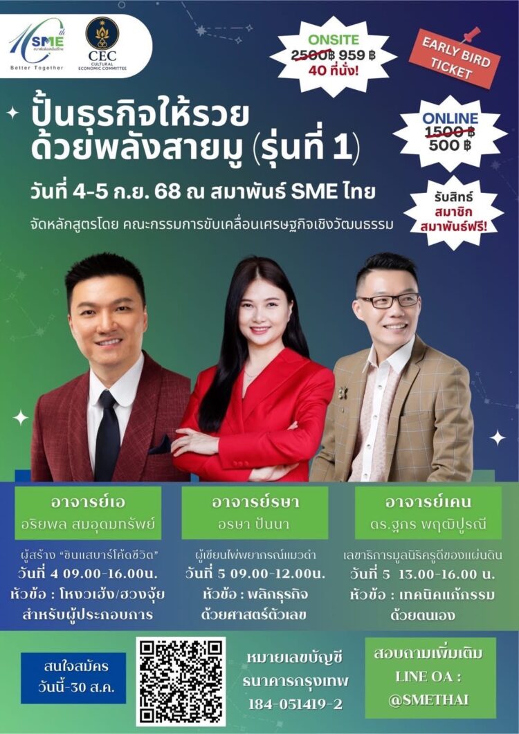 เอสเอ็มอีมีเฮ! คอร์ส “สายมูหลักร้อย” สอนมูแบบรู้จริง ไม่ต้องจ่ายหลักแสนประธานคณะขับเคลื่อนเศรษฐกิจเชิงวัฒนธรรม สมาพันธ์เอสเอ็มอีไทย ผุดไอเดียเจ๋ง จัดโครงการอบรม “ปั้นธุรกิจให้รวยด้วยพลังสายมู (รุ่นที่ 1)” หวังช่วยผู้ประกอบการเข้าใจศาสตร์โหงวเฮ้ง ฮวงจุ้ย และศาสตร์ตัวเลขอย่างถูกต้อง สร้างภูมิคุ้มกันทางธุรกิจ ป้องกันการถูกหลอก