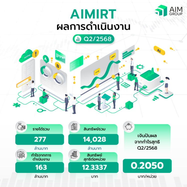 ทรัสต์เพื่อการลงทุนในอสังหาริ มทรัพย์และสิทธิการเช่าอสังหาริ มทรัพย์เอไอเอ็ม อินดัสเทรียล โกรท หรือกองทรัสต์ ‘AIMIRT’ เปิดเผยผลการดำเนินงานไตรมาส 2/2568 แข็งแกร่ง ท่ามกลางภาวะเศรษฐกิ จไทยและโลกที่ผันผวน พร้อมประกาศจ่ายเงินปันผลไตรมาส 2/2568 จากผลการดำเนินงานระหว่างวันที่ 1 เมษายน ถึง 30 มิถุนายน 2568 ในอัตรา 0.2050 บาทต่อหน่วย สูงที่สุดในตลาดรีทอุ ตสาหกรรมไทย