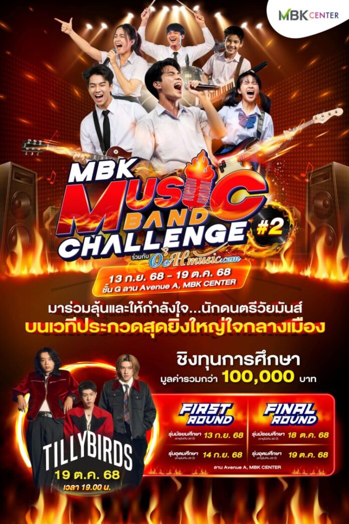 ศูนย์การค้าเอ็ม บี เค เซ็นเตอร์ สร้างปรากฏการณ์ ทางดนตรีอีกครั้งกับความมันส์ยิ่ งกว่าเดิมในกิจกรรมการแข่งขั นวงดนตรีวัยมันส์ MBK MUSIC BAND CHALLENGE 2025 ปีที่ 2 บนเวทีประกวดสุดยิ่งใหญ่ ใจกลางเมือง ชิงทุนการศึกษารวมมูลค่ากว่า 100,000 บาท มาร่วมเชียร์และส่งพลังใจให้กั บเหล่านักดนตรีรุ่นใหม่ที่มีเสี ยงดนตรีในหัวใจได้มาแข่งขั นความสามารถทางดนตรีและเสียงร้ อง ปลดล็อกศักยภาพปลดปล่ อยความสามารถแบบไร้ขีดจำกัดสู่ เส้นทางนักดนตรีอาชีพ โดยแบ่งเป็นรุ่นมัธยมศึกษา (อายุไม่เกิน 20 ปี) และ รุ่นอุดมศึกษา (อายุไม่เกิน 25 ปี) ในการแข่งขันรอบแรก (FIRST ROUND) วันเสาร์ที่ 13 และ วันอาทิตย์ที่ 14 กันยายน 2568 ณ ชั้น G ลานกิจกรรมเอ็ม บี เค อเวนิว โซน A
